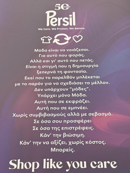 Με παρουσία μισού αιώνα στην Ελλάδα το Persil αλλάζει και πάλι τα δεδομένα στην περιποίηση των ρούχων και συμβάλλει στην ευαισθητοποίηση και εκπαίδευση των καταναλωτών για την υιοθέτηση μιας πιο υπεύθυνης καταναλωτικής στάσης απέναντι στη μόδα. Με το μήνυμα «Shop like you Care», γιόρτασε την επέτειο με ένα αποκλειστικό upcycling Pop-Up Store αφιερωμένο στη βιώσιμη μόδα. Η πρόσκληση έγραφε να φέρουμε ένα ρούχο που δεν φοράμε και εκεί, σε συνεργασία με τέσσερις σύγχρονους δημιουργούς- A Shiny Day, Memorabilia Lovers, Danai Smou και IkoArtLab -θα μεταμόρφωναν τα παλιά ρούχα σε ολοκαίνουργιες δημιουργίες, αναδεικνύοντας την αξία της βιώσιμης μόδας.